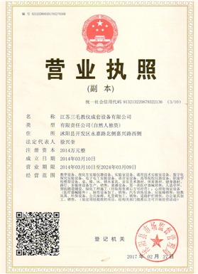江蘇三毛教儀成套設備有限公司是一家集設計、生產、銷售、售后為一體的大型制造企業。坐落于風景秀麗的花木之鄉、全國經濟百強縣、國家級經濟開發區沭陽縣永嘉路。
